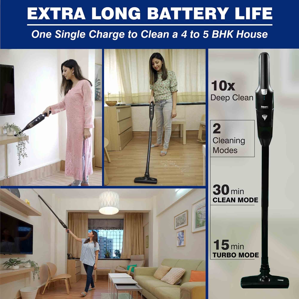 Product Highlights: - Colour: Black - Watt: 100 - Powerful suction - Ultra-Light Weight - Multipurpose and suitable for multiple surface types Details from Manufacturer: Material: ABS Colour: Black Weight (gm): 1400 Power Source: Cordless Dimension (in cm) (L x H x B): 24D x 12.5W x 113H Wattage: 100 Voltage: 220 (AC) Surface Recommendation: Hard Floor Runtime: 25 minutes Charging Time: 4 Hours Filter Type: Metal filter Pack Contents: 1N – Floor Brush, 1N – Combined Brush, 1N – Vacuum Cleaner main body, 1N – Charging Station and 1N – User Manual, 1N – Hepa Filter, 2N – Extension Tube Model Name: Balzano Tornado Cordless Vacuum Cleaner, Vacuum Cleaner for Home, 2-in-1 Portable Car Vacuum Cleaner, Multi-Purpose & Ultra Lightweight, Powerful Suction to Clean in One-Go, Extra Long Battery (Black) Key Features: Powerful Suction Ultra-Light Weight – Only 600 grams Multi-surface cleaning Multi-purpose usage Extra Long Battery Life Dual Filtration System Handheld & Stick No need to change bags