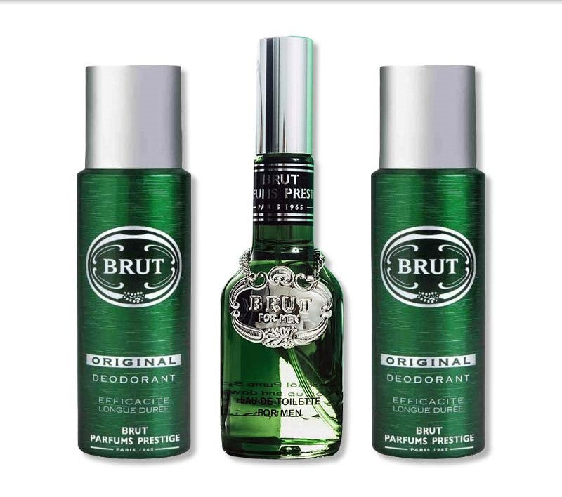 Brut Original Classic Perfume And 2 Deodorants 3 Piece Combo Brut, one of the most popular men's colognes was first launched in 1964 by Faberge Paris. Top notes of this super sexy masculine perfume comprise of lemon, bergamot, lavender, anise and basil which blend very subtly into middle notes of geranium, jasmine and ylang-ylang. The trail holds a strong fragrance of sandalwood, oak moss, vetiver, patchouli, tonka bean and vanilla. Brut Perfume is widely advertised with the slogan "The essence of men". The nose & innovator of this fragrance is Karl Mann. This set contains: 1 X 100ml Brut classic perfume , 2 X 200ml deodorant. We only sell 100% ORIGINAL BRUT COLOGNE, You might find few websites selling cheaper which may not be authentic.