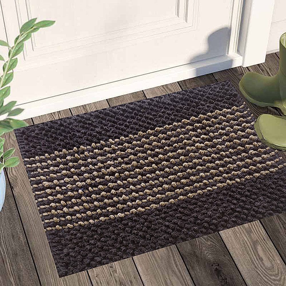 Overview This mat is made of chenille and in bobble construction in 2 different contrast colors, which gives a very unique look to the mat. It has long lasting durability. Details Size: 38 X 58 cms Material: Polycotton Package Contents Door mat: 1 unit