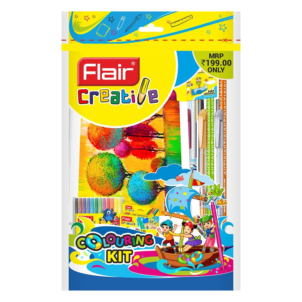 Product Highlights: - All-in-one art kit - Great for beginners - Allows creative exploration Details from Manufacturer: Product Details: Material: Assorted Colour: Assorted Kit Ink Colour: Assorted Kit Weight (in gms): 380 gm Dimension (in cm): 37 X 24 X 7 Pack Content: 1 Drawing Book / 2 Wooden Pencils / 12 Colours Wax Crayons / 12 Oil Pastels / 2 Glitter Gel Pens / 2 Hotline Fineliner Pens / 12 Miniz Sketch Pens / 12 Mini Colour Pencils / 1 Plastic Scale 30 Cm / 1 Sharpner / 1 Eraaser How to Use: - Colouring Kit About the Brand: Flair