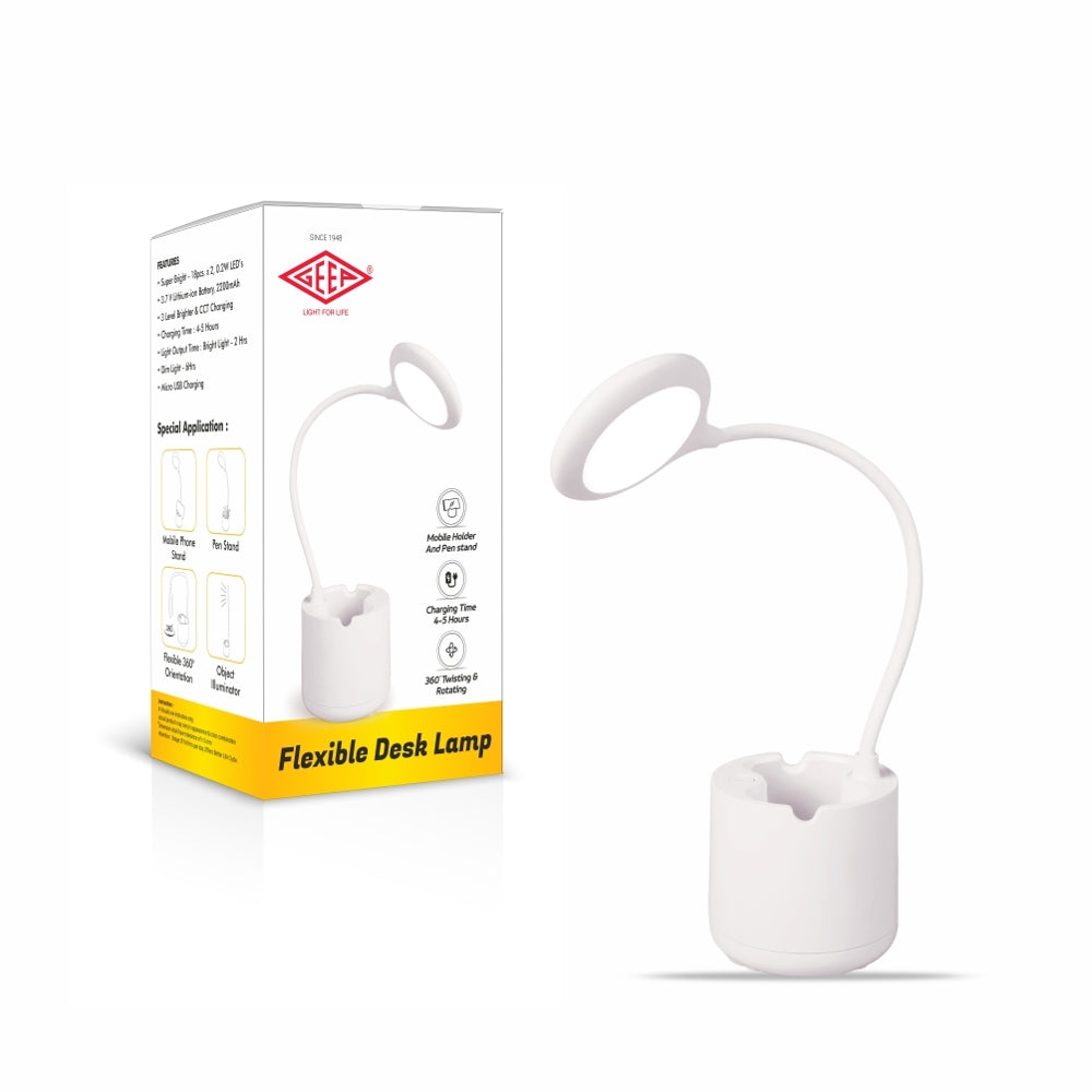 Key Features : - Flexible 360 Degree Orientation - Object Illuminator - 360 Degree Twisting & Rotating - Mobile Phone Stand - Pen Stand - Charging Port - Portable - 1500mAH Lithium-Ion Battery Disclaimer if any : - While we work to ensure that the product information is correct, actual product packaging and material may contain more or different information from what is given here. Please read the product labels, description, directions, warning and other information that comes with the actual product before use. Pack Contents : - 1 Desk Lamp - 1 Charging Cable About the Brand : - Geep is a leading brand into manufactoring of AA & AAA Zinc Carbon Batteries, LED Bulbs and luminaries, Electrical Accessories, Dry Cell Torches, Rechargeable Torches, Rechargeable Flashlights, Rechargeable Desk Lamps, Rechargeable Table Lamps, Mobile Accessories, Mosquito Rackets etc. We have our State Of Art manufacturing facilities in Thane, Bhiwandi, Silvassa, Masat, Chennai, Baddi, Guwahati. While we work to ensure that the product information is correct, actual product packaging and material may contain more or different information from what is given here. Please read the product labels, description, directions, warning and other information that comes with the actual product before use. Manufacturer Info : Manufacturer Name : Geep Industries India Private Limited Manufacturer Address : Plot No.70, Govt.Ind. Estate, Masat, Silvassa-396230. Dadra & Nagar Haveli, India Customer Care Phone Number : 1800 210 0163 Customer Care Email ID : info@thanawalagroup.net Country Of Origin : India