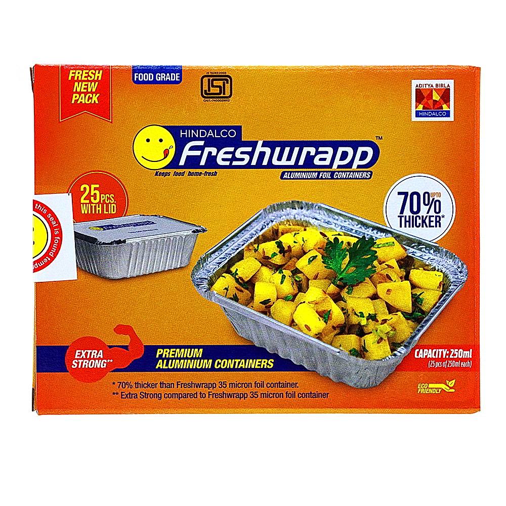 Key Features - BIS Food grade - ISI certified - Premium aluminium containers - Paper lid inside the box How to Use - Take away - Tiffin - Travelling - Picnic Disclaimer - Not to be used in the microwave oven Benefits - To keep food home fresh About the Brand - Freshwrapp is a brand from the Foil & Packaging Business of Hindalco Industries Ltd., which is a part of the Aditya Birla Group