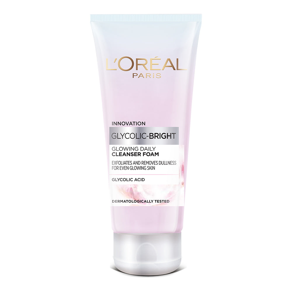 L'Oreal Skincare Laboratories developed Glycolic-Bright Glowing Daily Cleanser Foam to gently exfoliate and deeply cleanse the skin. With dense creamy foam, thoroughly clears impurities and makeup. With the smallest molecular weight amongst all brightening Alpha Hydroxy Acids, it penetrates deeply and effectively accelerates the skin's own renewal.