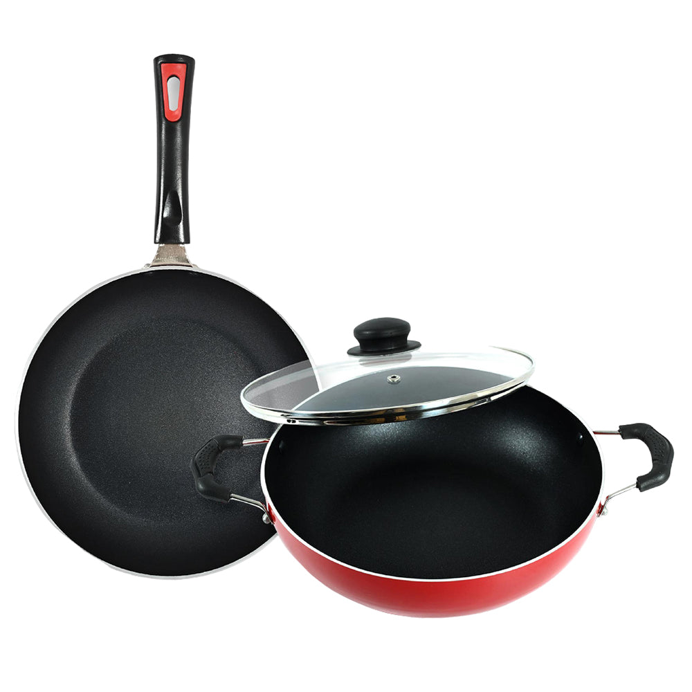 Product Highlights: - Includes Kadai and Fry Pan. - Glass Lid - Pure Aluminium - Lead-Free - Efficient Heat Retention Details from Manufacturer: Product Details: Material: Aluminium Type: Non-Induction Shape : Round Weight: 1150 gm Colour: Red Induction Base: No Thickness: 2 mm Steel Lid: No Glass Lid: Yes Pack Content: 1 Kadai, 1 Fry Pan & 1 Glass Lid Product Care Instructions: 100% Virgin Aluminium, It Is Lead-Free Ensuring Safe & Healthy Food. Our Pure-Grade Aluminium Cookware Is Lightweight & Very Good at Distributing Heat & It Helps Maintaining High Heat Temperatures Resulting in A Faster Cooking Process & Saving Energy at The Same Time.