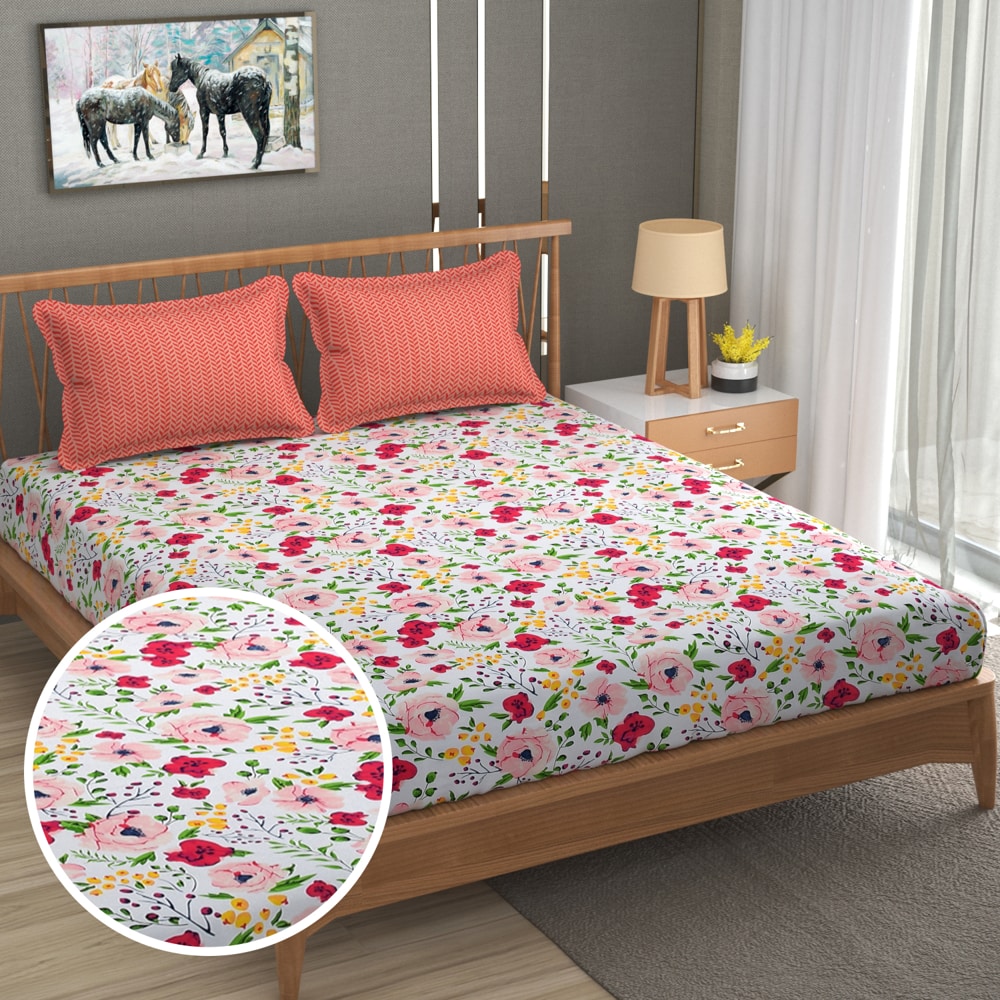 Product Highlights: - Premium Microfibre Material - Stylish Floral Design - Ample Size for Double Beds - Complete Bedding Set - Easy to Care For Details from Manufacturer: Material: Microfibre Pattern: Floral Colour: White & Pink Thread Count: 120 GSM Bedsheet Dimension: 227 x 254 cm Pillow Cover Dimension: 68 x 49 cm Size: Double Pack Contents: 1 bedsheet, 2 pillow covers Care Instructions: Wash in cold water for easy maintenance. About the Brand: Mafatlal has a legacy of over 117 years, established in 190- The brand is known for its commitment to quality, blending traditional craftsmanship