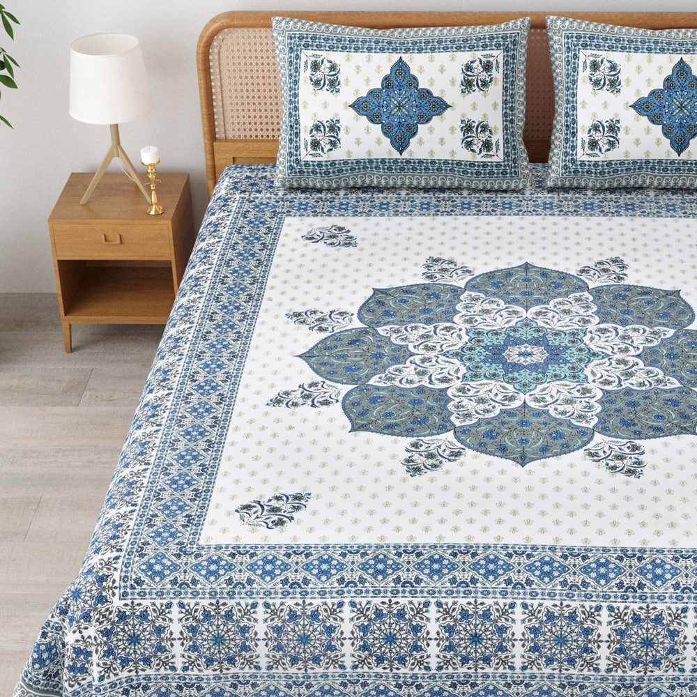 Product Highlights: - Beautiful floral design adds a touch of elegance. - Crafted from 100% pure cotton for comfort. - Comes with 2 pillow covers for a complete set. - Simple care instructions for easy maintenance. Details from Manufacturer: Material: Cotton Pattern: Floral Colour: Blue Thread Count: 144 Bedsheet Dimensions: 234cm x 270cm Pillow Cover Dimensions: 46cm x 69cm Pack Content: 1 Bedsheet 2 Pillow Covers Key Features: - Perfect for a good night's sleep. - Enhance room aesthetics. - Suitable for both hand and machine wash. - Designed for long-lasting use. - Everything included for your bedding needs. Benefits: Revitalizes your bedroom decor effortlessly. Provides comfort for restful nights. Matches well with various interior styles. Quality you can trust from a reputable brand. Convenient and easy to care for. Care Instructions: First Use: Wash separately. Wash Type: Hand wash or machine wash. Bleach: Do not use bleach. Drying: Line dry in shade. Iron: On medium heat. Dry Clean: Do not dry clean. About the Brand: Mafatlals has a rich heritage, creating beautiful fabrics since 1905. Our commitment to quality and craftsmanship combines traditional methods with contemporary designs, offering affordable luxury.