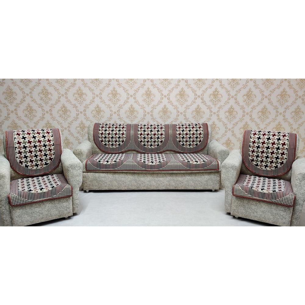 Overview Experience the unique blend of style, comfort, and practicality with MHF Cherry Polycotton Sofa Slipcovers. This set includes Six pieces: One three-seater back cover, One three-seater seat cover, Two single-seater back covers, and Two single-seater seat covers. Perfectly designed for a 5-seater (3+1+1) sofa, it ensures a snug and secure fit. Crafted from premium-quality fabric, it offers extreme durability. With its elegant Maroon and Geometric pattern, it adds a touch of sophistication to your home decor. Our products are hand-washable and reusable. Whether you're looking to protect your new sofa or refresh the appearance of your existing one, MHF Sofa Covers provide an easy and cost-effective solution. They're not just sofa covers; they're a promise of quality, functionality, and design. Transform your living room today with MHF Polycotton Sofa Slipcovers! Other Must Know Information - MHF products are not only stylish but also easy to maintain. They are hand-washable and reusable, making them a practical choice for any home. Whether you want to protect your new sofa or refresh the appearance of your existing one, our sofa covers offer an effortless and budget-friendly solution. - Suitable for 5 seater (3+1+1) sofa set Product Details - Length : 178 cm - Width : 68 cm - Weight : 1.2 kgs - Material : Polycotton - Colour : Maroon - Fit : 3+1+1 Pack Contents - Three Seater Back Cover : 1 Unit - Three Seater Seat Cover : 1 Unit - Single Seater Back Cover : 2 Units - Single Seater Seat Cover : 2 Units Care Instructions - Hand Wash Only