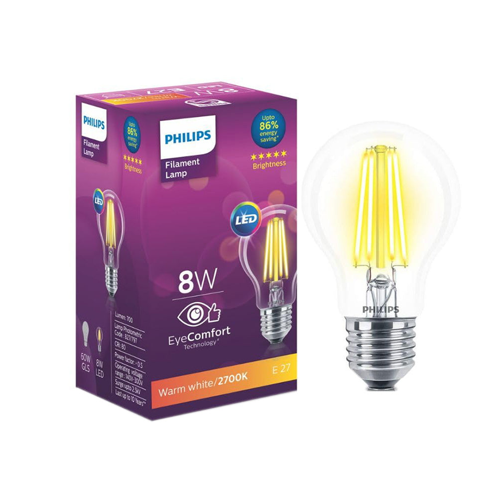 Product Highlights: - Comfortable for eyes - Warm white colour - 8 W bulb, 700 lumen - Saves up to 90% energy - Dimensions: 6.6×6.6×12 cm Details from Manufacturer: Material: Polycarbonate Wattage: 8W Weight: 0.055 gm Key Features: LED Lamp, Filament LED Lamp, Diffused LED Lamp, 8W LED Lamp Pack Contents: Philips Filament Led Lamp A60 2700K: Warm White (8W):1 U While we work to ensure that the product information is correct, actual product packaging and material may contain more or different information from what is given here. Please read the product labels, description, directions, warning and other information that comes with the actual product before use. Manufacturer Info : Manufacturer Name : SIGNIFY INNOVATIONS INDIA LIMITED Manufacturer Address : Signify Innovations India Ltd., (Registered Office) PS Arcadia Central, 3A, 3rd Floor, 4A, Abanindranath Thakur Sarani (Camac Street), Kolkata-700017, West Bengal, India Customer Care Phone Number : 000-800-050-7777 Customer Care Email ID : customercare_ecolinklighting@signify.com Country Of Origin : India