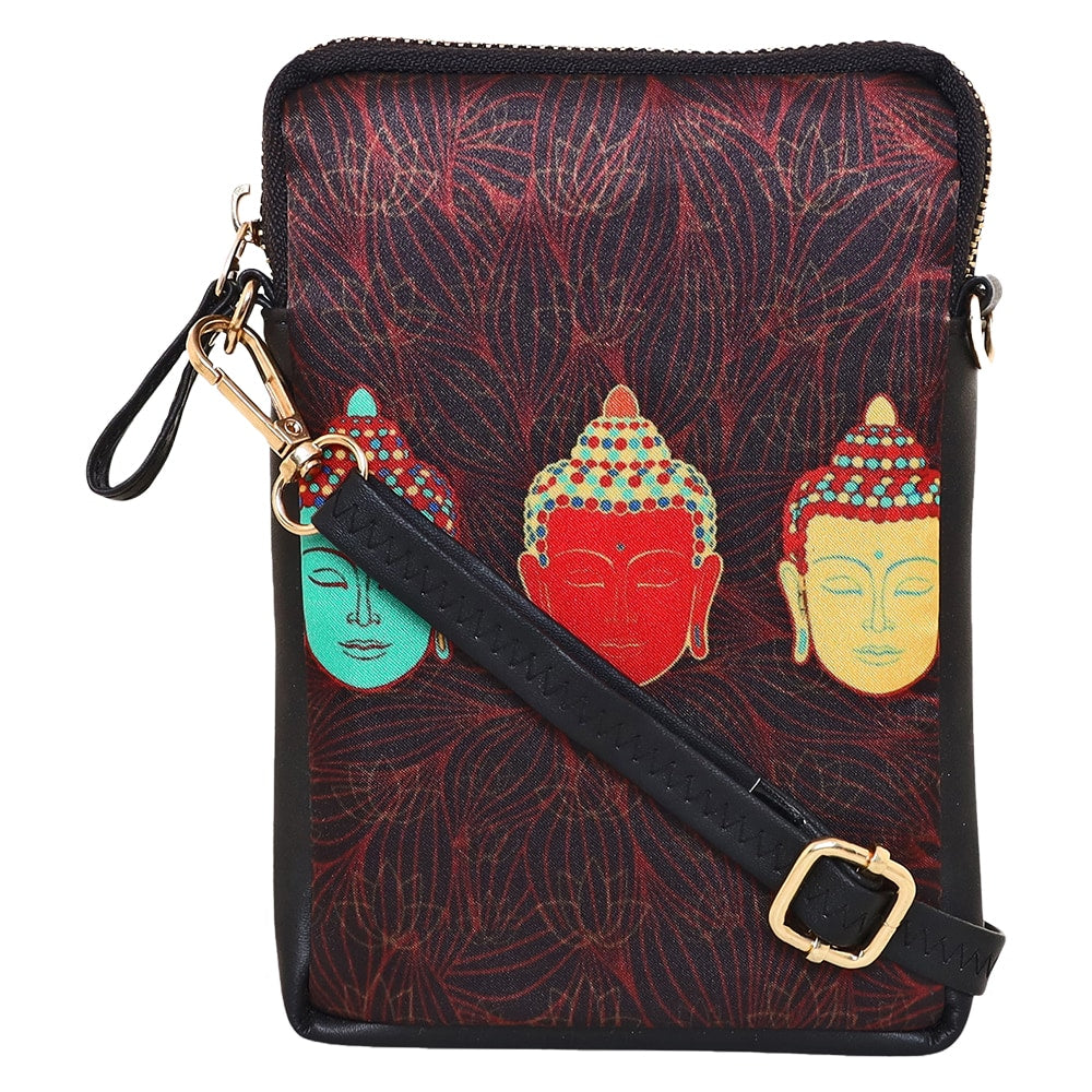 Product Highlights: - Pocket for Smartphone - Adjustable strap - Stylish design - Water-resistant material - Black colour Details from Manufacturer: Colour: Black Weight (gm): 120 Type of leather: PU Internal Material: Polyester External Material: Satin Pattern / Design: Buddha Design Dimension (in cm) (L x H x B): 14 x 1 x 18 cm Closure type: Zip No of Compartment: 1 Key Features: Smartphone pocket, Adjustable strap, Stylish design, Water-resistant material Pack Contents: 1 Bag Other Must Know Information: Suitable for all Seasons Care Instructions: Simply wipe it with a damp cloth or sponge About the Brand: Sabhyata is a brand of bags and other accessories that are made in India. They offer a wide range of products including handbags, backpacks, wallets, and more, all made with traditional Indian fabrics and designs. Some of the materials used to make Sabhyata bags include satin, cotton, and canvas. The brand is known for its use of vibrant colours and motifs from Indian culture.