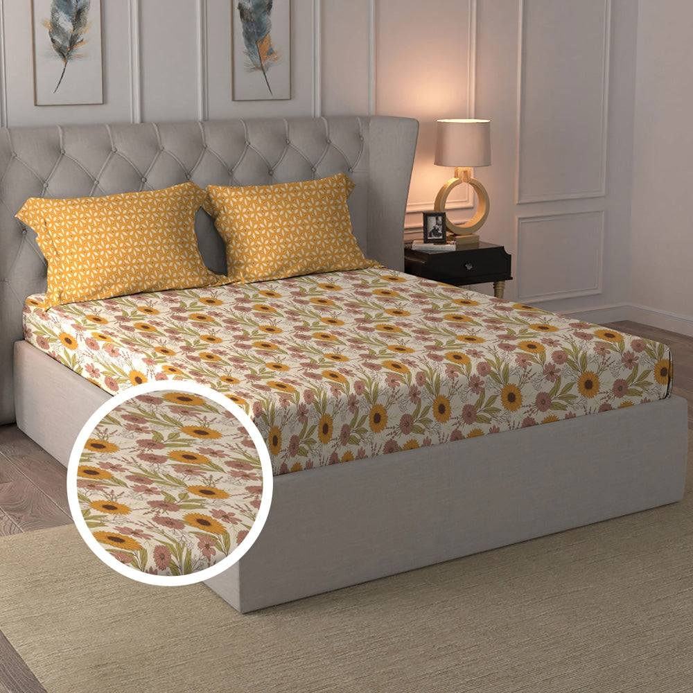 Details from Manufacturer: - Colour: Yellow - Pattern: Floral - Size: Queen Size - Bed sheet size: 228x254cm - Pillow Size: 46x69cm - Package contains: 2 pillow covers and 1 bed sheet - Material: 100% cotton Overview: The Trident Comfort Living Double Bed Sheet is crafted with a 120-thread count fabric, delivering a smooth and breathable texture for a restful night’s sleep. Its classic design and high-quality construction make it a great addition to any bedroom decor. This bed sheet fits double-sized beds, providing ample coverage while maintaining its shape and colour over time. Key Features: - 120 Thread Count: Soft and lightweight fabric, offering comfort and breathability. - Double Bed Size: Designed to fit standard double beds perfectly. - Durable Construction: High-quality stitching ensures long-lasting use and retains shape wash after wash. - Easy to Care For: Machine washable, colourfast, and wrinkle-resistant for low-maintenance care. - Elegant Design: Available in a variety of colours and patterns to complement different bedroom styles. Material Used: - 100% Cotton or a cotton blend (depending on the variant), providing a soft and breathable texture. How to Use: Spread the bed sheet evenly over your double bed, ensuring it covers the mattress fully. Tuck the edges neatly under the mattress for a smooth and snug fit. For best results, wash the sheet before first use to enhance softness. Benefits: - Comfortable Sleep: The 120-thread count fabric offers a balance of softness and breathability, ensuring a comfortable and cool sleep environment. - Durable and Long-Lasting: The sturdy construction ensures the bed sheet holds up well to regular washing and daily use. - Stylish and Versatile: Available in a range of colors and patterns, it adds a fresh, elegant look to your bedroom decor. - Easy Maintenance: The sheet is machine washable and retains its color and texture over time, ensuring low-maintenance care. - Affordable Luxury: Offers a premium feel at an affordable price, perfect for everyday use. Other Must-Know Information: The bed sheet comes with pillow covers, offering a complete bedding solution. The fabric may feel slightly stiff upon first use but softens after washing. Ideal for regular home use or as a guest room essential. For best use, wash separately on first use. Do not use bleach. Iron on medium heat. Do not dry clean Storage Instruction: Store in a cool, dry place away from direct sunlight to prevent fading. Fold neatly and store with other bedding items to keep it clean and ready for use. Use a linen closet or drawer to maintain freshness. Frequently Asked Questions : Q. What is the thread count of this bed sheet? A. The Trident Comfort Living Double Bed Sheet has a 120-thread count, providing softness and breathability. Q. Will the colour fade after washing? A. No, the fabric is colourfast and designed to retain its vibrant colours even after multiple washes. About the Brand: Trident is widely recognized for its expertise in the textile sector, particularly in producing towels, bed sheets, and yarn. It is one of the largest manufacturers of terry towels in the world and a leading player in the home textiles market.