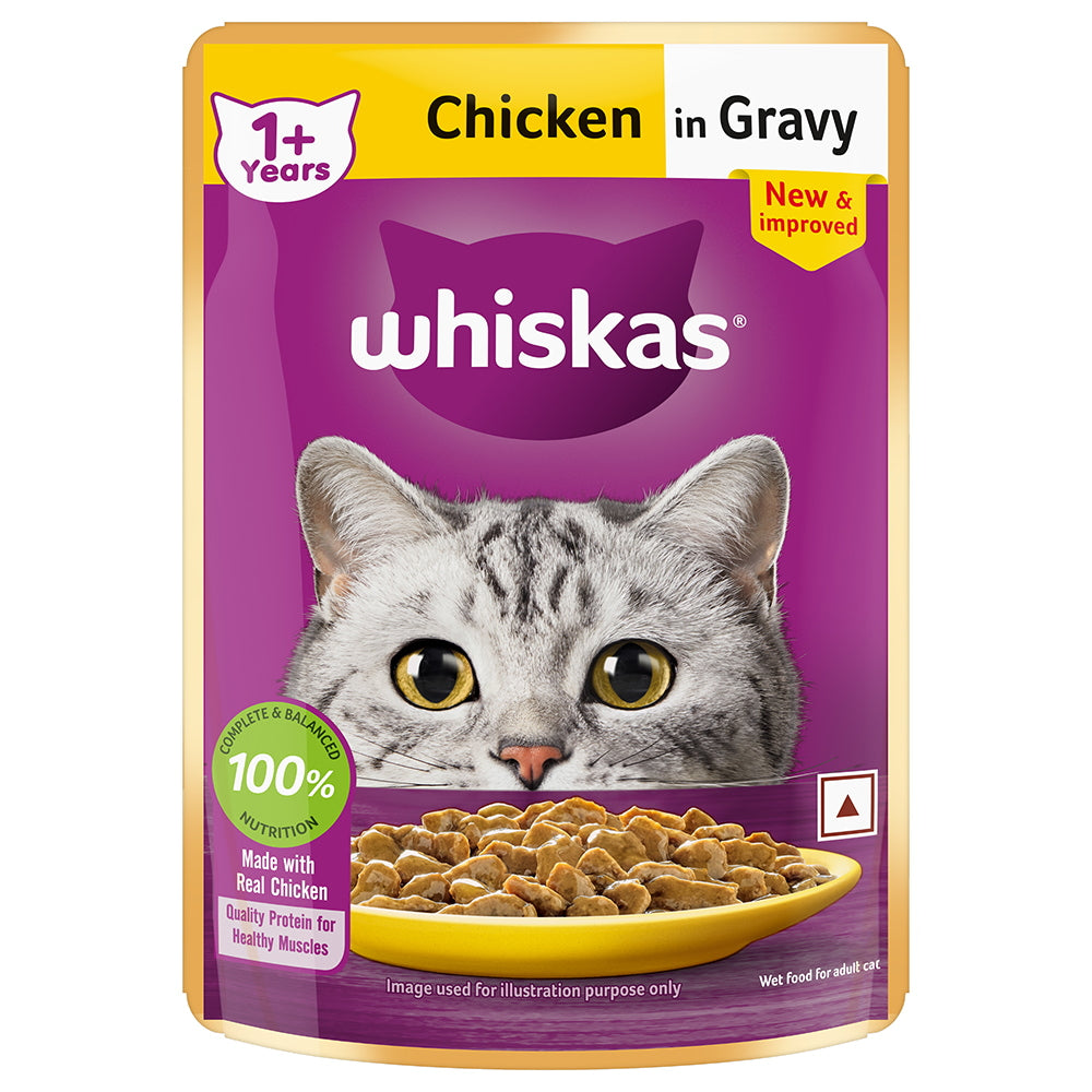 Overview Whiskas Adult Gravy Food provides complete nutrition for your adult pet cat and is an irresistible cat food for your special furry friend. Celebrate this by feeding your cat with a delicious festive treat for cats. A complete and balanced cat food, Whiskas gravy is designed to take care of cat’s daily nutritional requirements and provide it with all the required vitamins and minerals along with moisture and nourishment for a healthy and happy life, making it an ideal Treat. A cat's love for fish is thoughtfully blended with loads of calcium, phosphorus, proteins, antioxidants, vitamins & minerals, in each pack. It helps maintain its fur, heart-health, weight, skin, teeth, muscles, bones and overall immunity. Whiskas wet food has a texture and aroma that appeals to the palate of feline, and attracts even fussy eaters in for a filling and fun meal time! Key Features Complete and balanced nutrition Wet cat food recipe provides moisture and nourishment Gravy food format helps promote urinary tract health Helps provide cats with healthy eyesight Easy to eat and digest, ideal to be given to cats as treat Tempting aroma and flavour effective to attract fussy eaters Backed by research done by the Waltham Centre for Pet Nutrition For cat breeds from Persian Cat, British Shorthair to Siamese Cat Benefits Complete & balanced nutrition Supports urinary tract health Healthy eyesight Easy to eat & digest Supports healthy skin & coat Ingredients Meat and Animal Derivatives (Including 4% Chicken), Cereals, Minerals, Various Sugars. While we work to ensure that the product information is correct, actual product packaging and material may contain more or different information from what is given here. Please read the product labels, description, directions, warning and other information that comes with the actual product before use. Country Of Origin : Spain/Thailand
